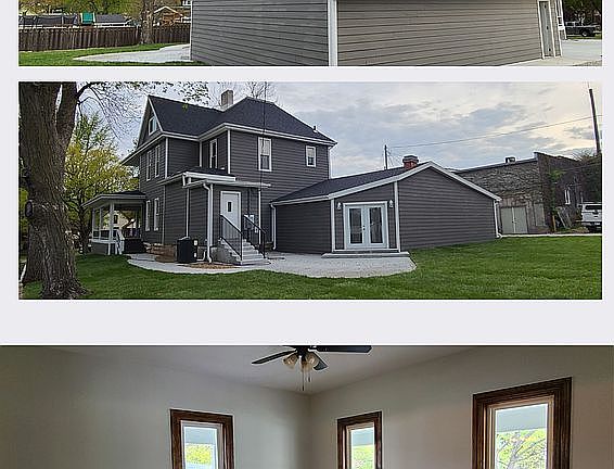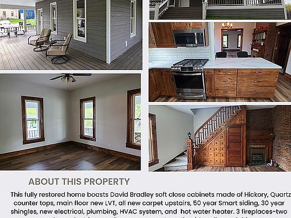 Fully restored historic home with character featuring three fireplaces-two gas and one electric, four bedrooms, two full bathrooms, walk in attic, completely remodeled kitchen with quartz counters tops and new hickory cabinets, 680 ft wrap around porch with new composite decking, attached two car garage with workshop, 50 year smart siding, new roof with 30 year shingles, washer and dryer hook up on main floor, all new pex and pvc plumbing, new water line to house and sewer video inspection, all new electrical with sub panels in attic and garage, 200 amp in main breaker box, new 95 % HVAC, new hot water heater, new appliances, new concrete patio, sidewalks, and garage floors. One block from courthouse square and post office. Home features new guttering with leaf guard and new insulation.