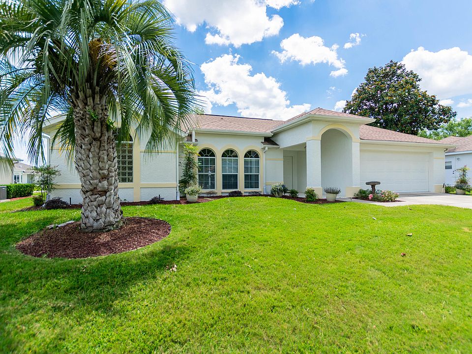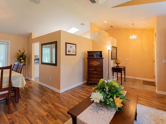 Beautiful 3/2/2 split plan home with high ceilings, lots of light and quality laminate and tile throughout. Separate living & family rooms, new roof in 2015, new AC in 2017. Very spacious living areas and gorgeous master with tray ceiling, french doors into bath with two lavs, walk-in shower and garden tub backed by glass block Paladian window. Big screened lanai accessible from master, dining room and family room. Cheerful, easy care landscaping. Lots of storage - 2nd bedroom has big walk-in, 3rd bedroom perfect for den/office/hobby room, laundry room has cabinets & lots of room for additional shelving, etc. This meticulously kept home is in perfect location in Ocala Palms: close to entrance and to pools, court, clubhouse and restaurant.