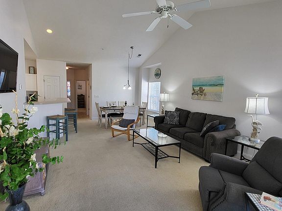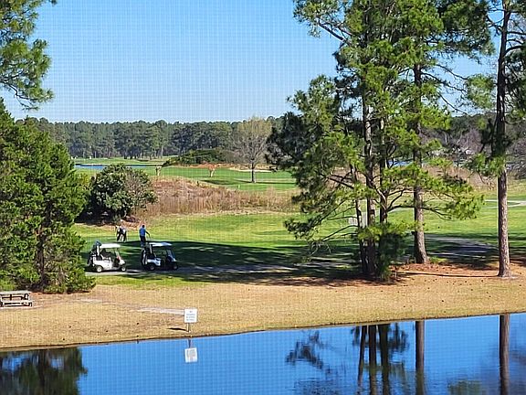 Enjoy the incredible view of the pond and golf course from this furnished 3 bedroom, 2 bath condo. Top floor, end unit, flooded with light, with nothing but the dramatic vaulted ceiling above you, and a wall of windows across the back of the unit to take in the expansive view from the great room, bedroom suite or screened porch. Currently a lovingly-maintained vacation home, with everything you need to step off the plane - or out of the car - and begin your vacation, but it would also be a fabulous primary home. Split bedroom plan, with the suite in the back to maximize enjoyment of the view, and two guest rooms and a full bath in the front. Spacious kitchen with everything you need to whip up a gourmet meal or heat up a frozen pizza, and a fully equipped laundry room to wash your beach towels. The community pool is just steps away from the front door, and there's a storage closet that's the perfect place to store your golf clubs, which you'll need to play at any of the dozens of golf courses within a half-hour's drive. Great location, about fifteen minutes to the beach, attractions and airport, with grocery stores and restaurants less than five minutes away, and easy access to major roads and highways, yet tucked away.