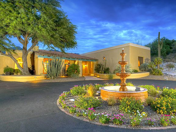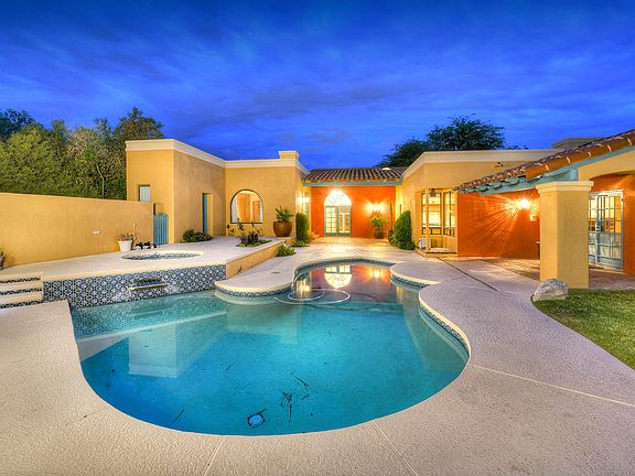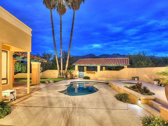 Perfectly situated on a private elevated lot, this fabulous Cat 10 Mediterranean Style home captures the expansive Catalina Mountain Views & Sparkling City Lights. Gallery style foyer welcomes you into this tasteful home. Multiple windows & french doors allow abundance of light to fill these generous rooms. Stunning interior design includes Sandstone flooring, dramatic Cantera fireplace, exposed beam ceiling & claw foot tub. Gourmet kitchen features high end appliances, 6 burner Viking range, double ovens, over-sized island & Sub Zero. Redesigned spacious Master suite includes glass enclosed shower, double vanities & large walk in closet, and cozy FP. Guests/teens will enjoy their own quarters which include 1 bed & separate living/kitchen area. Lush back yard with pool, spa & ramada.