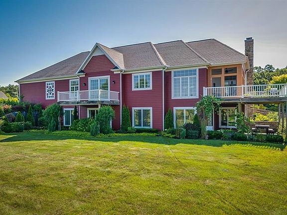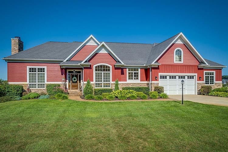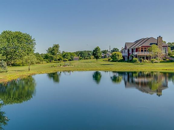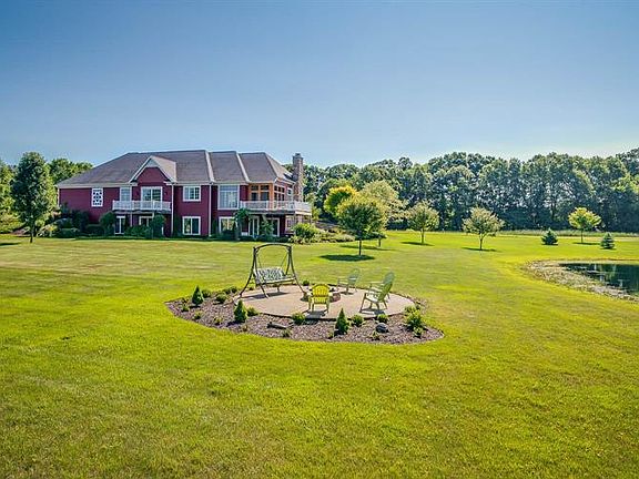 Agents in real estate for decades said "This is the most beautiful home I've ever seen!". Beautiful raised ranch home on a scenic, nearly 2 acre setting with a fully stocked pond. Expansive, open living from the great room with a floor to ceiling stone fireplace, to the open dining space, and the farmhouse style gourmet kitchen! A separate area adjacent to the great room provides a private sitting room or office. Lots of natural lighting and beautiful views from the large, energy efficient windows. Tremendous, luxe en suite with a beautifully appointed bath, large walk-in closet, and a private deck overlooking the beautifully landscaped yard. The wide stairway opens to a full walk out on the lower level. The walkout basement includes another large open living area, a second kitchen with granite countertops, dining area with great views, 3 more bedrooms, 2 additional full baths, and a convenient stairway direct to the oversized 4+ car garage. Comfortable radiant in-floor heat is available when desired in the master bath and shower, kitchen and the entire lower level. This amazing property offers summer days fishing in the fully stocked pond, enjoying fruit from several varieties of fruit trees, blueberries, raspberries, and more! A homestead like no other! Come experience this home soon! Sq. ft., and measurements approximate.