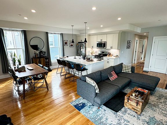 Spacious and sunny condo with luxury updates in premier West Roxbury location. 1 private parking spot! Sweeping open floorplan, tall ceilings with recessed lighting, surrounded on all sides by windows for beautiful natural light. Superior finishes throughout. Big eat in kitchen with gorgeous designer granite, XL white shaker cabinets and stainless steel appliances including gas range stove. Space for full dining table off kitchen. Kitchen opens up into a large living room for easy flow and entertaining. Three spacious bedrooms, all with big closets and new carpet. Master bedroom extra spacious, has king bed and en suite bathroom. Two full bathrooms total with granite vanities and tile showers. Washer dryer in unit. Central air and heat. Large private back deck. Can't beat these upgrades or this location in West Roxbury! Your private luxury escape in the city, with easy access to Boston and all that West Roxbury has to offer. Available 8/1! Landlord pays water/sewer, tenant pays gas/electric. Last month rent and security deposit due with lease signing. Pets allowed. No smoking in building.