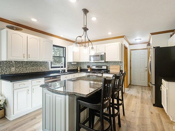 - Sound System, Bookcases, Walk-In Closet(s), Stone Counters, Eat-in Kitchen, Entrance Foyer, Kitchen Island, Natural Woodwork, Open Floorplan