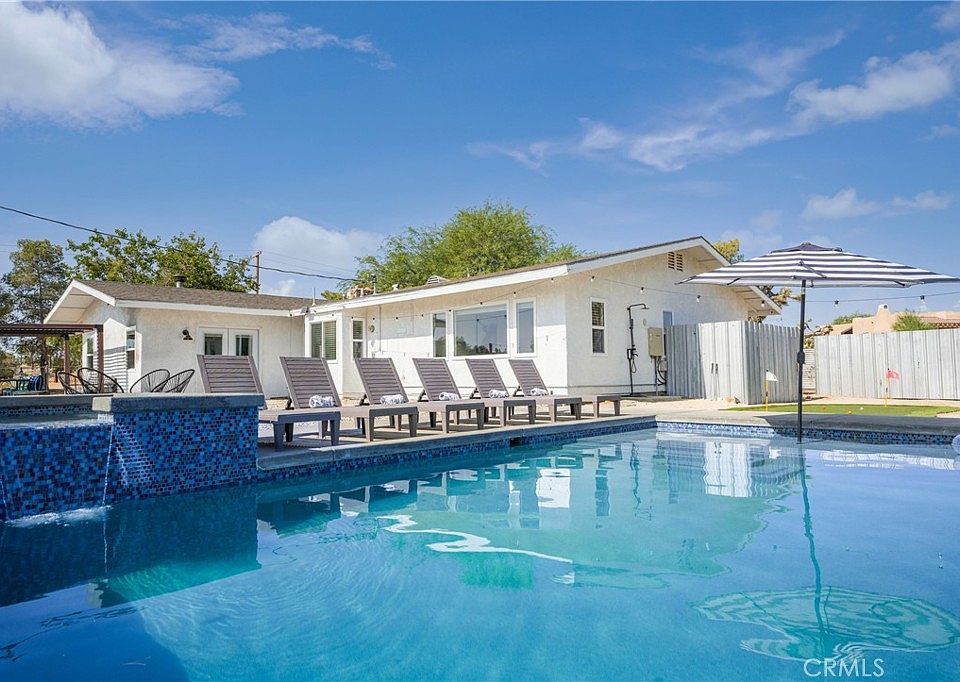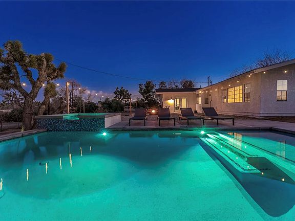 Recent upgrades include putting green, bathroom remodel, all new windows, and outdoor shower. A new salt water pool was installed in 2021. The property boasts 3 bedroom, 3 bathroom, 1,929 square feet and has been extensively remodeled with new flooring, paint, and tile throughout. The master bedroom is equipped with its own en-suite bath with a large soaking tub. The hallway bedroom also has its own en-suite bath with a full bathroom. The garage has been converted to a game room with a ductless mini split and hot pink pool table. There is a bar seating area outside of the attached garage that leads to hammocks and a fire pit with a gorgeous in ground pool and spa. This all sits on 2.5 acres zoned equestrian with nearby riding trails.