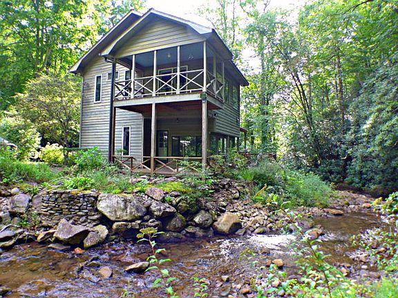 If you want to Live the Mountain Life then this is for you! Sit on any of your 3 Porches and watch the Rushing Creek that comes right behind the Home.You are close to Wayah Bald & all it has to offer w/ Views, History & Hiking Trails. The Home itself is One-of-a-kind and was Renovated in 1994. It has many special touches w/ it's Cypress Siding, Reclaimed Slate Walkway from Charleston, Reclaimed 100 Year Old Entry Door w/ Copper Overhang, Heated Marble floor in Foyer and Tasteful Bathrooms w/ Heated Ceramic Floors just to name a few.From the Foyer you enter into the Living Room w/ Wood Burning Stove and go through to the Kitchen, Sunroom w/lots of Windows, Guest Bath and Guest Bedroom.There are 2 Porches off of this Main Level. Venture Upstairs to a Large Open Loft area that can be used for a Family Room or extra Sleeping Quarters.Keep going into the Large Master Bedroom w/ Balcony overlooking the Creek.Master Bath not only has Heated Floors but a Heated Towel Rack & Soaking Tub as well. Outdoors you have that Great Creek that runs your Property and a 2 Car Garage with Full Bath & Laundry. Upstairs in the Garage is an Unfinished Living Area.Easy access off state rd and Borders USFS.