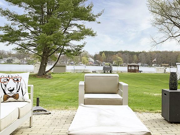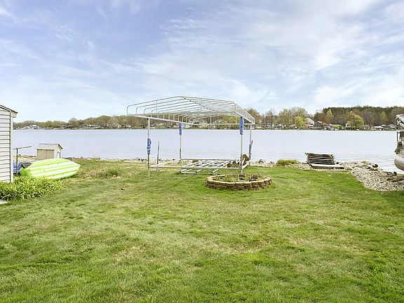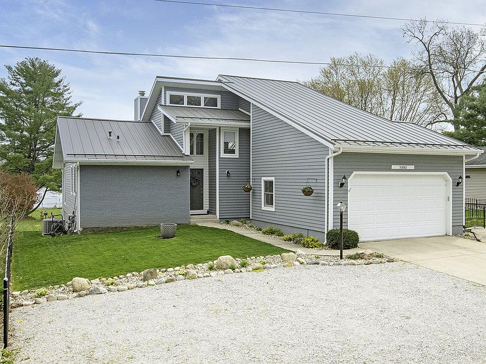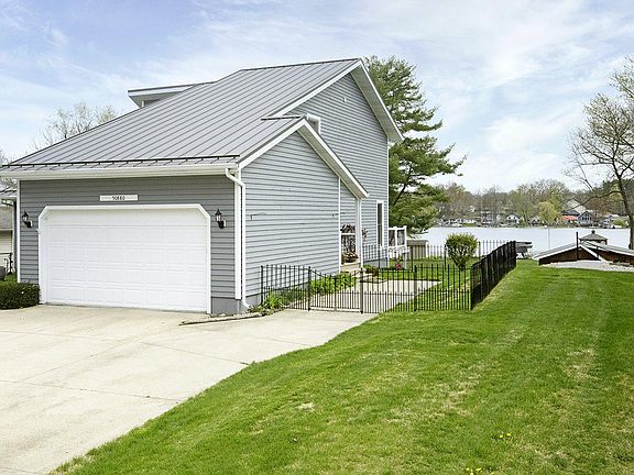 This contemporary-lined four-bedroom, three-and-a-half-bath, 3,523-square-foot two-story home on 1/2 acre comes with magnificent views of clear-water, all-sports Indiana Lake across a grassy, landscaped lawn with 65 feet of shallow, sandy waterfront. The interior has been thoroughly transformed in the past two years with new appliances and fixtures, elegant custom touches, and amenities designed for cooking, entertaining, recreation, and relaxation. On the main level, the living area with vaulted ceiling, fireplace, and upper deck access opens to the dining room with a black granite-topped table. The kitchen has stainless appliances, white granite counters, a powerful exhaust hood over a stove in view of guests, abundant cabinets, and a nearby pantry. New flooring is engineered hardwood. The master bedroom has a sitting area with lake views and a bath with dual vanities and a large glassed-in shower. The main area includes a powder room and mud room with exterior access to a side yard fenced with wrought iron. Upstairs are a loft with a seating area with lake views overlooking the living area, two bedrooms, and a bath. Downstairs are a family/recreation room with a black granite-topped bar with seating, an eating area, and access to a partly covered patio; a bedroom with ensuite bath; and a laundry room. The property comes with a two-car attached garage, a large waterside storage shed with electricity, and a fire pit. A pier, 22-foot AquaPatio pontoon, boat canopy, andfurniture and furnishings are available. Indiana Lake is a half-hour from Notre Dame, two hours from Chicago. MULTIPLE OFFERS RECIEVED. SELLER WILL REVIEW ALL OFFERS SUNDAY 4/25 at 3:00. Please have highest and best in by noon Sunday 4/25.