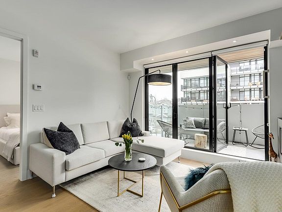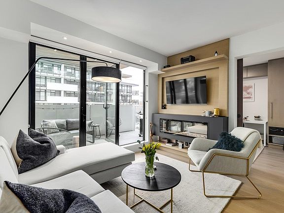 LOCATION IS EVERYTHING-SHIFT, located in the prime Main St Neighbourhood. COUNTLESS DETAILS in this contemporary plan!Featuring a glass window wall that slides completely open to an E. facing 120 sf balcony integrating indoor& outdoor spaces.Spacious Living area highlights the electric f/p w/ custom millwork surround. Gourmet kitchen includes MONOGRAM APPLIANCE PKG,striking quartz counterops complementing the blond cabinetry. Large island, great for entertaining & bar seating. Floor to ceiling bathroom tile, Wide plank white oak hardwood flooring thruout.Custom millwork in 2nd bedroom can be used for sleeping or home office.1 parking with EV charging station.Enjoy accessible living 1 blk from Main St w/ so many choices for shopping,numerous restaurants & cafes.QE & Riley Parks steps away.