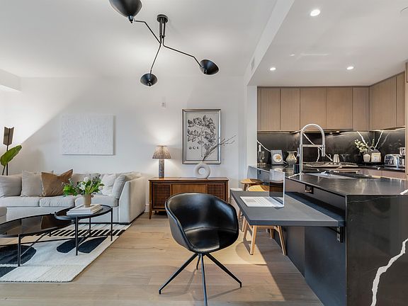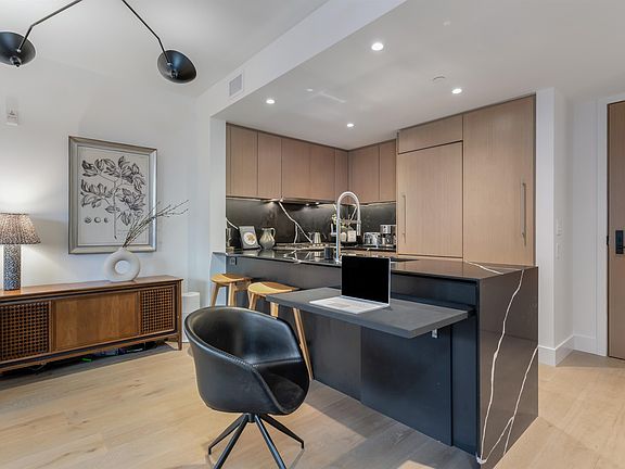 SHIFT by Aragon defines forward-thinking design & construction. Countless details echo a bold statement throughout this gorgeous & QUIET EAST facing 1 BED + large FLEX w/ storage. Bi-fold glass patio doors makes indoor/outdoor living seamless & a custom built-in desk makes working from home effortless. Living space fts. stunning wall-mounted electric fireplace. Ultra-strong timber beams support an innovative, cantilevered balcony that is 3x LARGER. Wide plank white Oak engineered hardwood & Oak custom millwork throughout & large closets. Fully integrated panelled Monogram series appliances, 3cm thick Mitered edge Quartz Countertops & backsplash & a deep-recessed 5-burner gas cooktop. Spa-like Ensuite feats Rain shower & NuHeat in-floor heated porcelain tiles. 1 EV parking & 1 storage, A/C.
