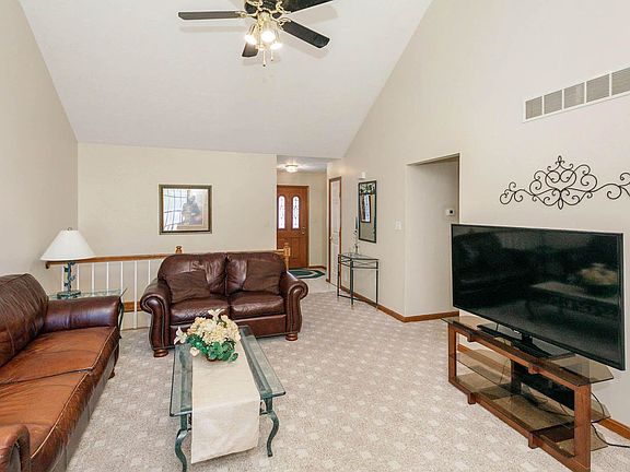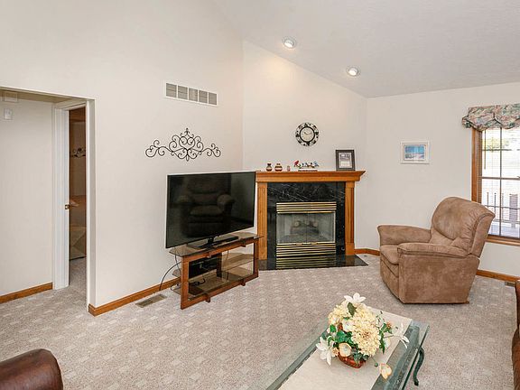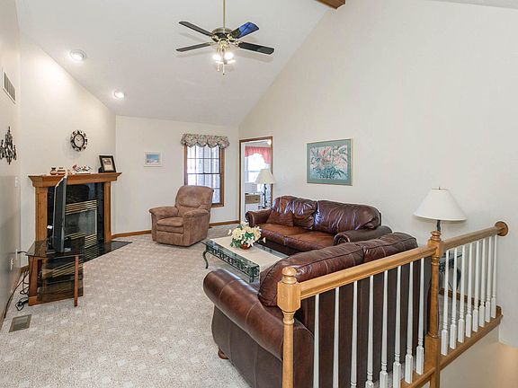 Neat as a Pin; Move right in! Well-maintained 3 Bedroom 2 Bath brick ranch. Great Room has vaulted ceiling, open staircase to basement, and gas corner fireplace with blower. Kitchen with spacious eating area and breakfast bar, ceramic tile back splash and convenient pull-out shelving in cabinets. Appliances remain. Front and middle bedrooms (with hall bath in-between) have double door closets. Master Bedroom features a tray ceiling, walk-in closet and en suite bath completely redone with new lights, a handmade vanity with granite counter top, porcelain tile floor and one piece shower. First floor laundry has a handy pantry/utility closet and cabinets above washer and dryer (which remain). Full, unfinished basement is ready to finish with bathroom plumbed in.Choose sun or shade on the partially covered deck with ceiling fan. 2- car Garage. Back yard has full privacy fence (2 side fences are vinyl). Maintenance free exterior. Ceiling fans in all rooms but laundry & baths. Pride of ownership shows here!