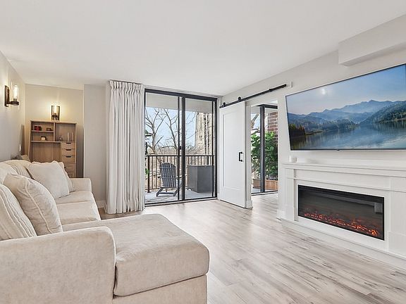 Completely renovated River Place condo offering panoramic views of Naperville's Riverwalk and just steps from downtown! This beautifully updated two-bedroom unit features an open kitchen with custom shaker cabinets, pullout shelves, and additional island cabinetry for extra storage. The kitchen is equipped with top-of-the-line Samsung fingerprint-resistant stainless steel appliances, a water line for the refrigerator ice maker, granite countertops, and a full-slab backsplash. Recessed can lighting and under-cabinet lighting illuminate the space. Luxury vinyl flooring extends throughout the condo, complemented by marble flooring in the stunning all-marble bathroom, which boasts a 72" vanity with double sinks, an LED mirror, a frameless glass shower door, and an extra-large shower with a full bench, rain shower, and hand sprayer. The living room features an electric fireplace with a mantel surround and a heating element, while both the living room and second bedroom have double sliders leading to a spacious terrace. Additional updates include all new doors and trim, upgraded lighting with Decora switches and dimmers, a new pocket door in the primary bedroom for ensuite privacy, and a low-ambient air conditioner kit. The laundry room is outfitted with a new Maytag washer and dryer, cabinetry, and recessed lighting. This unit also includes a climate-controlled storage space (#312) with shelving. Monthly HOA of $770 includes daily continental breakfast, heat, electricity, water and wastewater, cable, high-speed internet, recycling and trash service, snow removal, 24-hour fitness center with new equipment, common interior and exterior maintenance, community pavilion for events, and newly constructed community outdoor terrace with grill. Onsite management and maintenance staff, including business services (copy, scan, fax, etc.), Mon-Fri. A large pavilion with new, large deck overlooks the Riverwalk and pond for use by residents for private events. River Place is a prime location walkable to downtown Naperville shops, restaurants, and Naperville Central High School. 5th Avenue train station is 1.5 miles away, and transportation is reimbursed for commuting residents. This condo is move-in ready with modern finishes and an unbeatable location! Option to buy furnished.