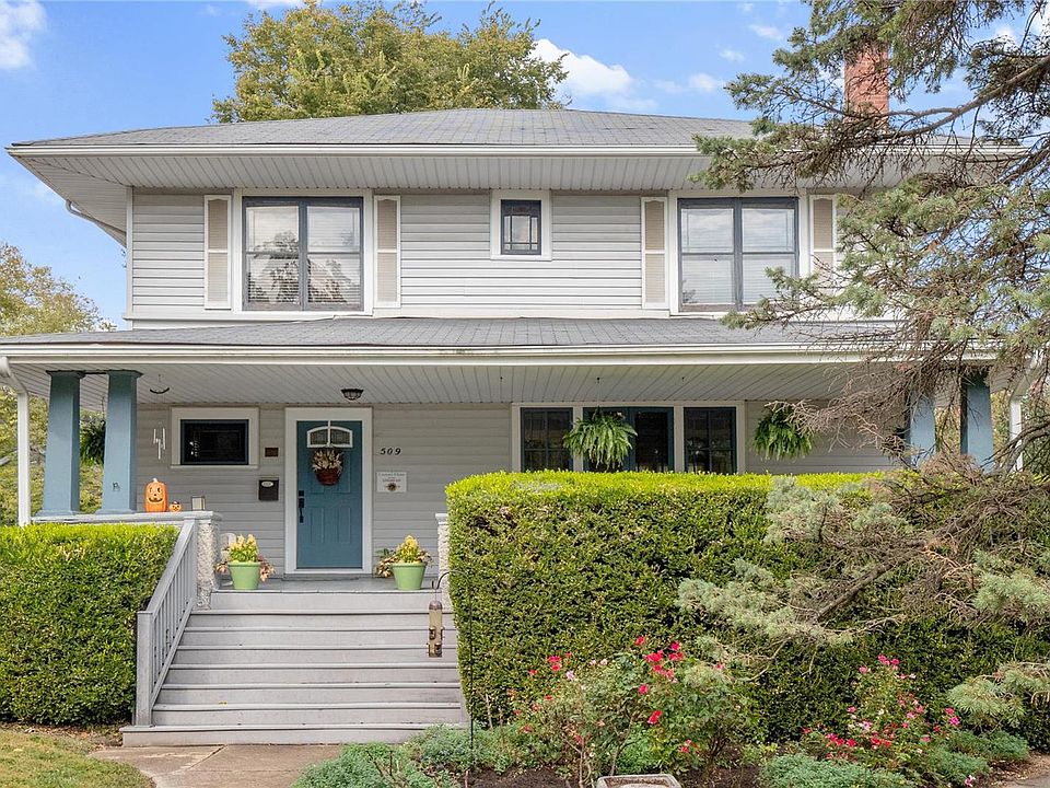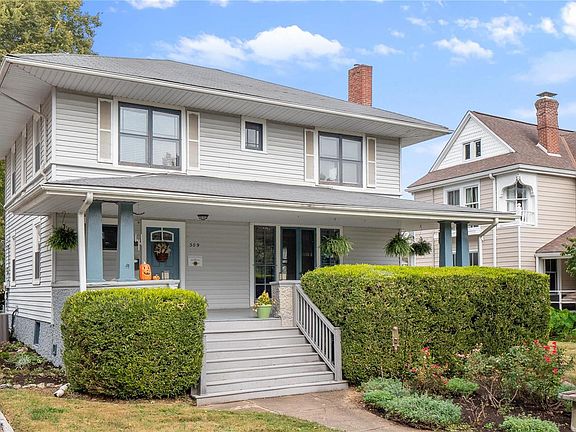 Historic Webster Groves "American Foursquare" designed by acclaimed architect, Edward Joy, circa 1910. The covered front porch opens into a large entry foyer that features a built-in storage bench and closet. This beautiful home maintains many historical features including coffered ceilings, original millwork, bay windows, built-in shelves, and 2 woodburning fireplaces. Refinished hardwood floors throughout the entry foyer, living room, and dining room. The kitchen and butler's pantry have been updated with granite, stainless appliances, and ceramic floors. Upstairs, there are 4 bedrooms and updated full bath (2017) with white subway tile, hexagon floor tile, & double sink vanity. The primary bedroom boasts a woodburning fireplace, and all 2nd floor windows have been updated. Detached 2 car garage and stamped concrete patio in backyard. This prime Webster location is a short walk to Old Orchard's restaurants and shops, as well as many outdoor events throughout the year.