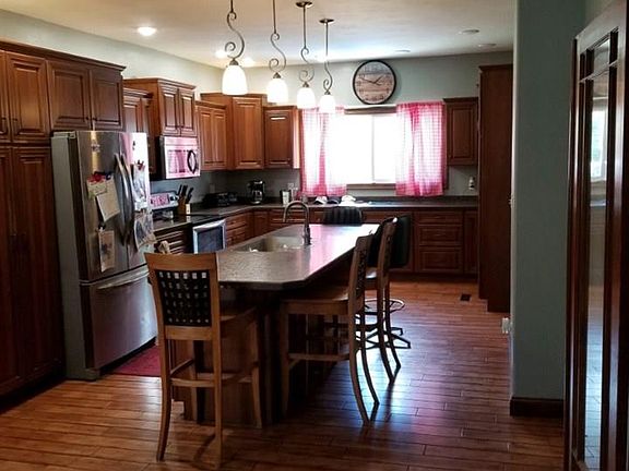Great 4 Bedroom home with beautiful wrap around porch has had extensive remodeling done to it. Located on a corner lot with cement patio between the home and detached 2 car garage and fire pit. This home has a very modern kitchen with Cherry cupboards w/ lots of pull outs for that extra room and an island bar along with a formal dining area and oak flooring. The main floor consists of a good size living room w/french doors and pocket door for privacy if wanted, full bathroom w/jacuzzi tub and main floor laundry. All appliances and washer/dryer will stay with the home. Upstairs is the 4 bedrooms and another full bathroom , then the attic is an extra place for lots of storage and basement for extra family entertaining area. New roof on house and garage 2018