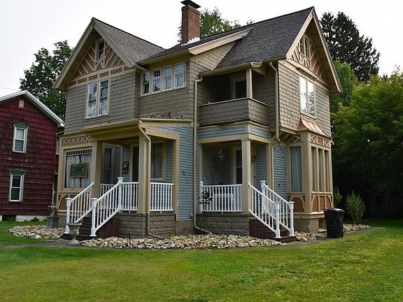 Formerly the Stately "Bush Estate" Victorian. Gorgeous woodwork, Hardwood floors, Updated cherry kitchen with all appliances leads to a new rear 15x17 concrete patio. Remodeled bath with whirlpool tub, walk-in shower & skylight. Front and rear stairs to 2nd floor, walk up floored attic for storage. Hot water tank - 2022, furnace 2021, and a 200 amp breaker box. Newer 2 car detached garage. Deep lot - frontage on Euclid Ave and Edwards Alley.