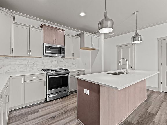 Luxury hwd style flooringCove crown moldingWalk in pantryLvp flooringStainless gas rangeTile backsplashQuartz counter tops
