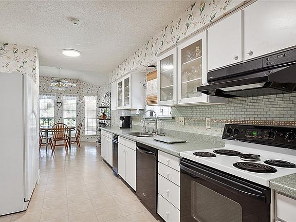 , breakfast room and kitchen are right off the den and also have high ceilings Large galley kitchen with solid surface counters and glass block back splash.