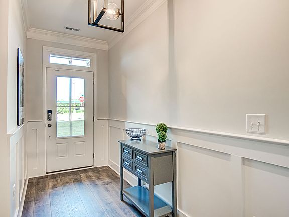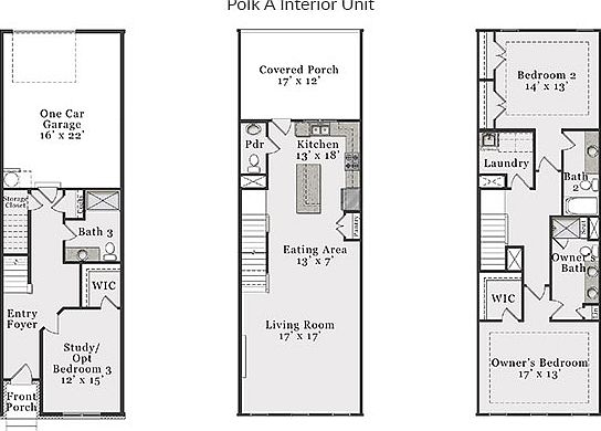 The Polk-A 3 bed, 3.5 bath interior townhome main level features an open floorplan with large living room, half bath and dining area. The kitchen includes stainless steel sink and appliance package with granite countertops and island for additional counter space. The large covered outdoor living area with privacy walls is perfect for entertaining or just relaxing outside in the fresh air and sunshine. The upper level includes the spacious owner's suite with walk-in closet and tray ceiling with crown molding. The owner's bath features tiled seat and walls in the shower, dual-sink vanity and linen closet. The central area has an open feel at the stairs and laundry room with optional sink. The second bedroom has a full bath and his-and-hers closets. The lower level features an entry foyer, a third bedroom with walk-in closet which can also be used as an office or entertainment/rec room, a full bath, and a garage with room for a vehicle and plenty of additional storage.