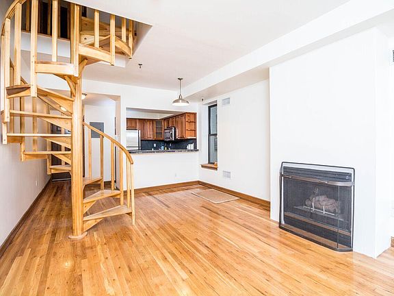 No fee! Comfortable duplex shows living and dining area focused around gas fireplace and large west facing windows. Open kitchen with stainless appliances. Large spiral staircase leads to two spacious bedrooms including master with a walk thru closet to renovated full bath. Laundry in building.
