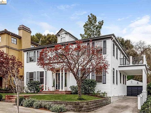 The exterior style is reminiscent of the New England Federal homes of the late 18th century, while inside is a fabulous arrangement of open Great Room, library/media room, formal dining and sunny kitchen with breakfast nook. There are just a few steps in, with a full bath on the main level. Upstairs are 4 bedrooms, 2 baths including en-suite for the main bedroom. A large 2nd floor terrace faces a lovely North Bay and hills view, including the San Rafael Bridge. 2 car detached garage. The lush front lawn with mature ornamental plants is a welcoming entry, with a low maintenance terraced garden at the back. On a low-traffic cul-de-sac with underground utilities, sidewalks and decorative street lights. Quick access to Rt. 13, AC Transit & Lake Temescal Regional Park. Montclair Village is 2 miles away with groceries, services, unique shops, great restaurants