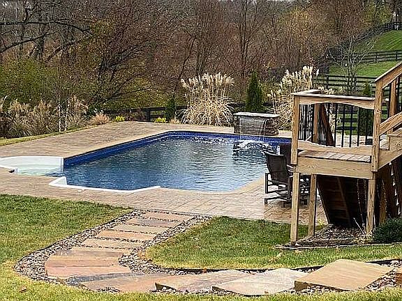 Beautiful ranch home with a full, partially finished, walk-out basement designed and built by Daniel Adkins Designs. Stone and brick enhance the lovely facade and upon entering you look through the Entry Hall to see the dramatic stone fireplace and grand vaulted, beamed ceiling of the Great Room. The very spacious Kitchen with abundant cream cabinetry and granite countertops adjoins the Great Room and also offers a large Breakfast Area. The formal Dining Room is to the left of the Entry Hall. The Master Suite features a Master Bath with a tiled walk-in shower, a soaking tub and a large closet. There are 4 other Bedrooms and 3 additional full Bathrooms. The full Basement walks out to a nice backyard with a full tree line at the back with inground salt water pool. A 3 car garage completes this lovely, livable home.