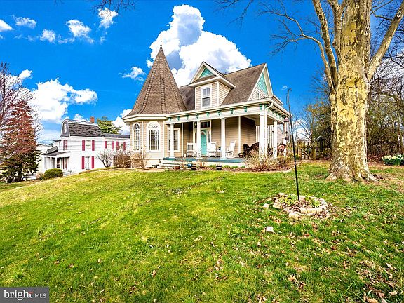 This stunning Victorian will take your breath away! This homes greets you with over 2600 SF of updated finished living space, original Heart Pine Flooring, Soaring Ceilings, Pocket Doors and a Turret! The kitchen has Mahogany Counters, a Soapstone Farm Sink, Customer Built Cabinets with lighting , Stainless Appliances and a Butler Style Pantry. There is a lovely Dining Area with doors that lead to the library with Custom Built-In Shelving and a Gas Fireplace. The Huge Living Room in the front of the house is in the turret and has floor to ceiling windows with amazing natural light. The addition off the back of the home has a Brand New Roof and is used as the Family Room. There is a Primary Bedroom on the Main Level with a Walk-in Closet and an Updated Full Bathroom. The owner had Customer Built-In Shelving/Storage inset to the wall that runs from the Library to the Walk-In Closet in the Primary Bedroom. The Upper Level has another Primary sized Bedroom, with an additional space in the turret that can be used as an office, art studio, nursery, sitting room, etc. In addition, there are two more nice sized bedrooms and a lovely Updated Bathroom with Skylights. The Laundry Space in upstairs as well. At the end of the upstairs hallway there is a door that leads to a Brand New Deck to Enjoy the Views of your Backyard. This home boasts just over 1/2 acre with a shed and a fenced in side yard. The location is amazing with I-70 a few minutes away and within walking distance to all the wonderful shops and restaurants that downtown Mount Airy offers. This home is a must see.