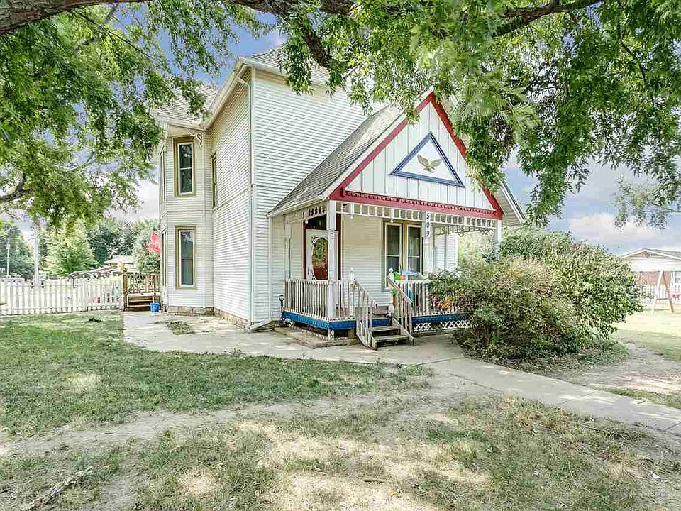 TRADITIONAL VICTORIAN HOME IN COLWICH! THIS ORIGINAL SEARS ROEBUCK HOME HAS TONS OF CHARACTER! THE INVITING FRONT PORCH, WHITE PICKET FENCE, AND MATURE TREES MAKE THIS CHARMING HOME A RARE FIND! THE LARGE KITCHEN FEATURES AN ISLAND WITH AN EATING BAR, A GLASS TOP STOVE, A PANTRY, AMPLE EATING SPACE, AND GREAT CABINET AND COUNTER SPACE. THE GORGEOUS FORMAL DINING ROOM FEATURES ORIGINAL HARDWOOD FLOORS, MODERN PAINT, AND A BAY WINDOW. THE SIZABLE LIVING ROOM OFFERS A BEAUTIFUL FIREPLACE AND LARGE WINDOWS TO LET IN NATURAL LIGHT. THE LIBRARY/OFFICE ON THE MAIN FLOOR BOASTS BUILT IN BOOKSHELVES AND A DESK. THE HUGE MAIN FLOOR LAUNDRY ROOM ALSO FEATURES A FULL SIZE BATHROOM. THE ORIGINAL STAIRCASE LEADS TO THE SECOND LEVEL, BOASTING 4 BEDROOMS AND A BATH. THE GENEROUS MASTER BEDROOM OFFERS NATURAL LIGHT FROM THE PICTURE WINDOW AND A HUGE WALK IN CLOSET. THE OTHER 3 BEDROOMS HAVE OVERSIZED CLOSETS AND NEWER PAINT. THE CHARACTER CONTINUES OUTSIDE, WHERE THERE ARE 2 STORAGE BUILDINGS, A STORAGE SHED, ESTABLISHED GARDENS, AND AN IRRIGATION PUMP AND WELL. MECHANICALLY, THIS HOME FEATURES NEWER PAINT, A NEWER HOT WATER HEATER, ZONED AIR CONDITIONING, AND A NEWER DISHWASHER. LOCATED ACROSS THE STREET FROM THE CITY PARK, AND JUST A BLOCK AND A HALF AWAY FROM THE ELEMENTARY SCHOOL, THIS HOME IS IN THE PERFECT LOCATION!