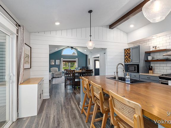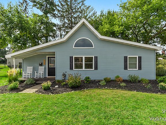 You have to see the inside of this adorable home to appreciate all the updates, and its great location, with Flat River and a park practically in your backyard, as well as a walking/bike path that takes you from Greenville to Lowell. This move-in-ready home features an open floor plan with cathedral ceilings in the living room and kitchen, stainless steel appliances, open shelving, an oversized oak island, and concrete countertops. Off the living room are two good-sized bedrooms. There is a beautiful tiled full bath off the entryway for your guests to use. Down the hall is the laundry room, as well as the primary suite, featuring a spacious tiled shower and a large walk-in closet. This home offers luxury vinyl flooring, tile, a pellet stove, and in-wall speakers to name a few. Central air was just added. The backyard is fenced and includes a shed, and you have off-street parking for entertaining.