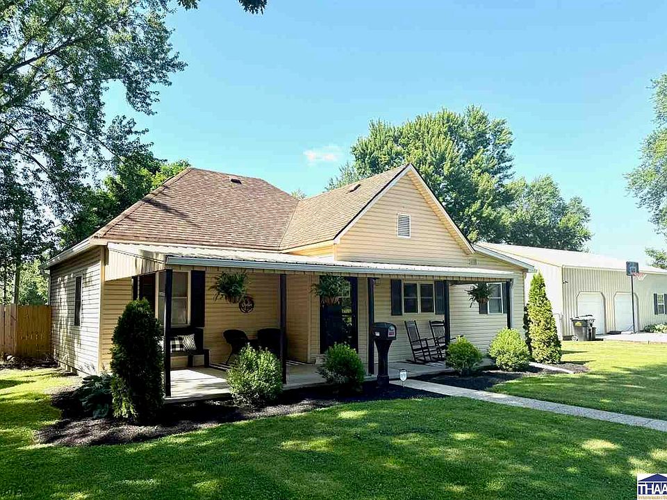 This beautifully updated 3-bedroom, 1-bath home sits on 2 spacious lots and offers a perfect blend of charm and modern updates. Enjoy outdoor living with three porches, new landscaping, and a privacy-fenced backyard - ideal for relaxing or entertaining. Inside, you'll find a remodeled bathroom (2024), a kids' bedroom remodel (2023), and a newly added laundry room (2023). The kitchen features new countertops, backsplash, and sink, with all new kitchen appliances included. Lighting has been updated throughout the home, and all interior doors have been replaced for a fresh, cohesive look. Additional improvements include a new AC unit with heat pump (2023), furnace and water heater (2019), new gutters, and the installation of a moisture barrier. There's also a 30x40 pole barn, perfect for storage or hobbies. This move-in ready home has been thoughtfully updated and is ready for its next owner!