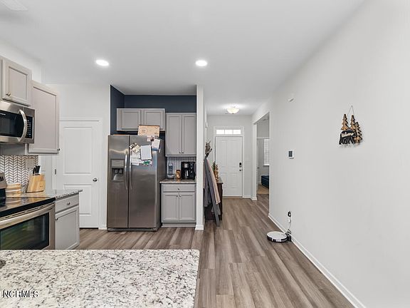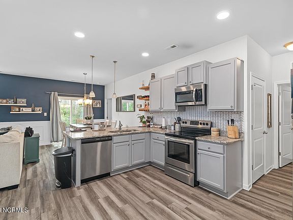 Tucked away at the end of a quiet cul-de-sac, this charming 3-bedroom, 2-bathroom home offers the perfect blend of privacy and convenience. Surrounded by a beautiful wooded setting, it's ideally situated just one mile from the Intracoastal Waterway fishing pier and midway between Camp Lejeune and Wilmington. Step inside to an inviting open floor plan filled with natural light. The home boasts luxury vinyl plank flooring throughout the main living areas and plush carpeting in the bedrooms for added comfort. The upgraded kitchen is a showstopper, featuring 36'' maple cabinets, elegant pendant lighting, and a granite counter-height bar that seamlessly connects to the family and dining rooms perfect for everyday living or entertaining guests.