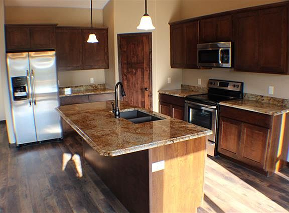 Beautiful New Construction Home featuring custom granite counter tops in the kitchen and bathrooms and vaulted ceilings in the main living area. This home is more than 3,200 square feet with an open floor plan on the main level featuring a stone fireplace, tile master bathroom and shower, custom steel railing with custom wood posts for the stairs and of course let's not forget an amazing kitchen to match the unique features throughout the home. The basement features a family room, 2 bedrooms, full bathroom and an office. Custom rock on the exterior of the home that will welcome you as you enter this one of a kind rustic theme house. Yard will be fully landscaped with a sprinkler system. This beautiful home could be yours!