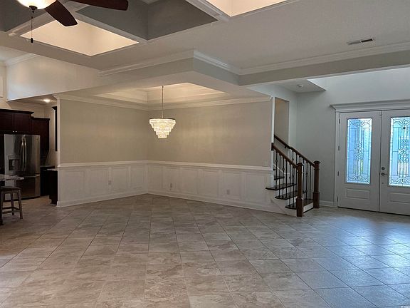 Welcome to this stunning custom home, 4 bedrooms, 3 full baths with a side load garage located in the highly desired Waterway Palms Plantation, an Intercoastal Waterway Community (ICW) in Carolina Forest. The house boasts a grand double entry door, a spectacular 18-foot-high foyer and offers an open floor plan living experience. The layout features a formal dining area with tray ceilings and wainscoting walls. The great room features a beautiful gas fireplace, custom mantle and deep (12-foot six inch) pocket coffered ceiling. Upon entering the kitchen, you have the perfect setup for entertaining and cooking. Large center island with wrap-around stool seating, gas cooktop with an outside vented hood, wall oven and microwave, extensive cabinetry with soft close drawers, and beautiful marble counters with subway backsplash. Throughout the open area is 18-inch angled porcelain flooring, high-end custom lighting and extensive crown molding. The back of the home, the Primary-Owner's suite, offers beautiful views of the wooded backyard. Split walk-in Primary closets with custom closet systems, double sinks, and a grand all tile, multi-head shower with separate soaking tub. Off the great room, opens the 8-foot, triple sliding glass doors and enjoy nature from your heated/cooled 4 seasons room. This room also has wood inlaid ceilings, and gorgeous tiled flooring. Notice the well thought out doggy door system, that allows your dog(s) to flow from the office, through the 4 seasons room and out to the fenced in private backyard. The first floor also features 2 additional bedrooms and/or an office option with a full bathroom. Proceeding up the oak staircase to the upstairs suite, where you will find another private nice sized bedroom and living space, with a full bathroom. There is a large walk-in storage room on the upper floor as well. The rear of the house area offers an extensive patio area and fenced rear yard with privacy as it backs up to a protected community owned woodland; no houses to adjoin rear of the property. The garage space is oversized with enough area for two large vehicles and a golf cart. The exterior features low maintenance with Hardie board siding and trim, irrigation, and lighting. The house features a wired security system and tankless water heater. Waterway Palms Plantation is a 24/7 gated community with an impressive amenities center, featuring resort style pool, tennis court, basketball court, gym, bocce, cornhole, private boat ramp in to the ICW, day docks, massive two-story amenity building, and a HOA managed secure boat storage lot. Waterway Palms allows for quick access to Hwy 31, and just a short drive to Schools, Grocery Stores, Hospitals, Urgent care facilities, Shopping, Golf, Restaurants, and the Beach.