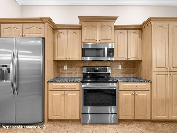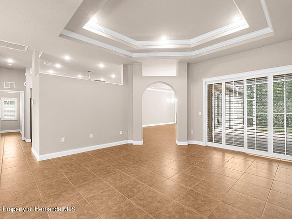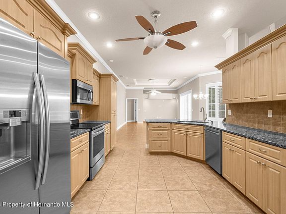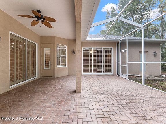 MOVE-IN READY! Gorgeous, LARGE home located in the highly-desired, gated, golf community of Hernando Oaks! BRAND NEW ROOF NOV 2023! 4 bedrooms + 3 full bathrooms + 3 car garage + extra large extended brick paver screened lanai abutting the HOA-owned buffer property with views of the trees - feels so private! Located on a dead-end road with no through traffic! Enjoy your coffee in the mornings in the spacious outdoor living space connecting with nature - make it your own private oasis! The home is LARGE with 2,600 sq ft of living space and 3,552 total sq feet! High ceilings and tray ceiling with large glass sliders and large windows lets in a lot of natural light making the home feel spacious, light, bright, and comfortable! The home offers a formal living room with double tray ceiling, a family room with tray ceiling, a formal dining room and a breakfast room! The kitchen is impressive with and upgraded with granite countertops, beautiful cabinets, large breakfast bar, stainless steel appliances, and even a wine refrigerator! The master bedroom is spacious with sliders to the outdoor living space! It offers dual walk-in closets and an enormous ensuite bathroom with dual granite vanities and white, square under-mount sinks, large soaking garden tub, and large walk-in shower!! The kitchen is in open to the family room and great for entertaining family and friends! The 2nd and 3rd bathrooms are also upgraded with granite counter tops and white under-mount sinks! The bedroom and bathroom in the back of the home can be closed off with a sliding door making it a great little mother-in-law suite or guest area with privacy! The 3th bathroom has lanai access for your convenience! Beautifully landscaped and great curb appeal! AC 2016. The home is located in Beautiful Brooksville! Visit Historic Downtown Brooksville for festivals, art and craft shows, cafés, antique shops, horse-drawn carriage rides at Christmas, music on the square and so many fun things to do and connect with your community! Located 5-7 minutes from the Suncoast Parkway for quick and easy access to Tampa for work and play! 20 minutes to sunsets at Pine Island, kayaking down the clear Weeki Wachee River with the manatees, swimming, boating, fishing, boating and so much more!! Come see this move-in ready home!