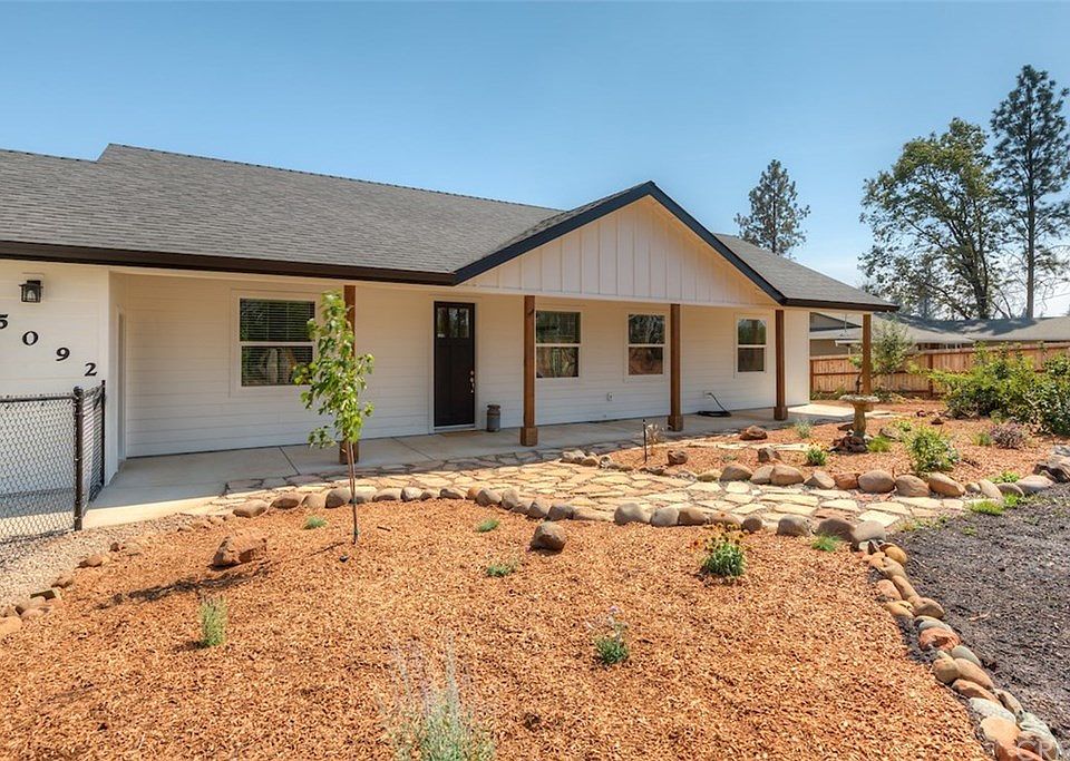 This brand new 2020 built home boasts a farmhouse appeal on generous sized parcel that abuts a walnut orchard. Located just 15 minutes outside Chico in what is known as Paradise's "banana belt", this location is ideal. The home is positioned in a way to allow ample driveway space alongside the home with RV parking and room for a shop. The large covered front porch gives ample space to enjoy the fenced in front yard with lush landscape and charming rock borders and a dry creek bed. Once you step into the home, you'll appreciate the open concept layout that allows ample room for entertaining and a kitchen to fall in love with. Boasting soft close cabinets, Kitchenaide stainless range, stainless hood vent, subway tile backsplash and granite counters. On the south end of the home is where you'll find the indoor laundry and master suite equipped with dual vanities, quartz/tiled shower and quartz counters. The other end of the home is where the hall bath, spare bedroom and additional 3rd room is located. Now step out back and the opportunities are endless with this huge backyard! There are many other upgrades to this home and you certainly won't want to miss your chance, set up your showing today!