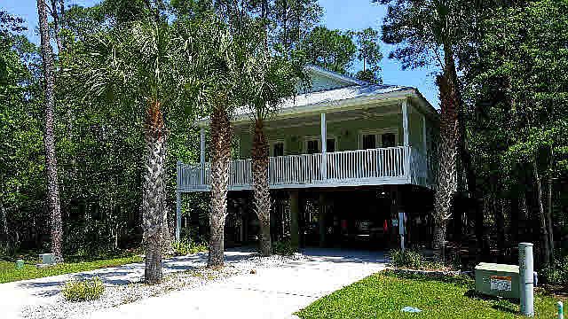 BACK ON THE MARKET! Fresh paint and new carpet. Just minutes away from the beach and a few steps from the river, this quiet 3 bed / 2 bath cottage features stunning wood floors, plantation shutters, and a large open floor plan. The kitchen is equipped with stainless appliances, granite counters, and a long bar. The covered front porch and tall palms provide an inviting entrance. The back porch is uncovered, and is accessible from the master and 2nd bedroom. The master bathroom includes double vanities, a stand up shower, and a tiled in bathtub. Below the home is a screened in porch for entertaining, and a large storage area adjacent to it. River Pines Subdivision is a small, quiet, street with a fishing pier right on the Bon Secour River. The pier features first come, first served boat docking, and is located just 800 feet away.