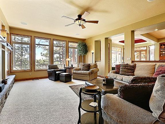 This Craftsman style 2-story mountain home was constructed with superior quality finishes and features down to the smallest details throughout and offers truly impressive and functional indoor and outdoor living spaces. This home is sited on a beautiful ¾ acre lot with numerous original Ponderosa pines and native areas with natural vegetation that blend with the formal professionally landscaped areas. The setting is complete with peek-a-boo views of the Front Range mountains spanning from Pike’s Peak to the north peaks. You will find oak hardwood flooring, slab granite countertops, Canac cherry Mission style cabinetry, Millgard casement windows trimmed in wood, surround sound speakers, a central vacuum system, an American tankless hot water heater, two furnaces, two central air conditioning units and humidifiers among the many special features. A distinguishing feature that sets this home apart from the rest is the professionally designed and finished outdoor living area created especially for this property by Colorado Creations. The space is covered, partially enclosed and includes a gas fireplace, built-in storage cabinet and a grill space that includes a JennAir stainless steel grill with gas hook-up. The outdoor room also has speakers and is hard-wired for installation of electrical heater units in the eave of the rooflines. Additional outdoor entertainment spaces include an HOA approved play structure or fire pit area and an area with synthetic grass enclosed by a powder-coated fence that is accessible via the outdoor living room. The generously sized gourmet kitchen truly is one of the focal points of this home. With access to the great room, adjoining eating space and outdoor living room, it easily lends itself to being the “hub” of casual gatherings. Appointments include slab granite countertops, Canac cherry Mission style cabinetry, planning desk, upgraded stainless steel appliances, center island with breakfast bar, a walk-in pantry and a bumped out breakfast nook with coffered ceiling. The main floor master bedroom suite offers a serene getaway to enjoy mountain views from the built-in window seat and to bask in the luxury of the adjoining 5-piece bathroom that is appointed with a jetted Lasko tub, a separate frameless glass shower, vanity and cherry cabinetry. Other bonus features includea walk-in closet, built-in shelving and art niches. The unfinished walk-out basement offers 2,392 sq.ft. of space for immediate expansion that includes a roughed in bathroom, structural wood floor, workshop and an expansive covered patio. The floor plan provides both formal and informal living spaces, a loft on the upper level, a main floor master bedroom suite plus four additional bedrooms upstairs, a main floor study, 5 baths and over 4,000 finished sq.ft. above grade. This home was designed with an active family in mind. Just take a look at the functionality of the voluminous 4-car tandem garage, the oversized laundry room and family bath, the bonus room upstairs that the kids will love and the outdoor living area. Neighborhood Description The Timbers is located in the southern end of the Pinery subdivision in Parker, Colorado. The owner’s association is made up of 133 families. Known for larger lots and upscale homes, The Timbers offers mountain-style living close to comfort conveniences found in the nearby town of Parker. Residents enjoy three parks within the Pinery that are maintained by the HOA providing opportunity for play, picnics and exercise; one park that is just down the road from Bingham Lake, a beautiful spot to spend a lazy afternoon; and a third park that is in the process of being created. It will provide beautiful mountain views with wildflowers, and trees to attract birds and butterflies and eventually will have benches for picnicking or just enjoying the beauty. The Pinery Country Club and Golf Course has memberships available for golfing, tennis, fitness and aquatics and offers 27 h
