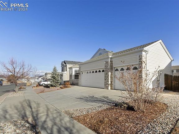 Experience the serene lifestyle of the Wagon Trails neighborhood in this beautifully designed home, offering open concept living that maximizes mountain views and natural light. The living room, featuring vaulted ceilings and a fireplace, opens up to a patio through sliding glass doors, extending your living space into the beautifully landscaped backyard. The kitchen is spacious, complemented by a dining nook with a bay window that brings in the morning light. The primary bedroom boasts vaulted ceilings, an ensuite bathroom, and a walk-in closet, creating a private oasis. Additional living space is provided by a finished basement, accompanied by an additional bedroom and bathroom, while the three-car garage offers ample storage and parking. This property's unique location provides direct access to a system of trails connecting to numerous parks and the Wagon Trails Recreation Center. With grocery shopping and dining options just around the corner, this home blends convenience with the tranquility of its surroundings.