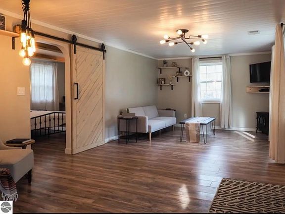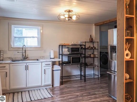 This charming one-bedroom, one-bathroom home in Mesick has been newly remodeled and sits on a spacious 5.65-acre lot. The property boasts two impressive 30x40 pole barns, perfect for storage or workshop space. A picturesque creek runs year-round through the land, adding a serene ambiance to the surroundings. With its fresh updates and expansive outdoor area, this home offers a blend of comfort and potential for various uses, all set in a peaceful, rural location. This property is highly booked on Airbnb with a 4.85 star rating and 48 reviews for the last year.