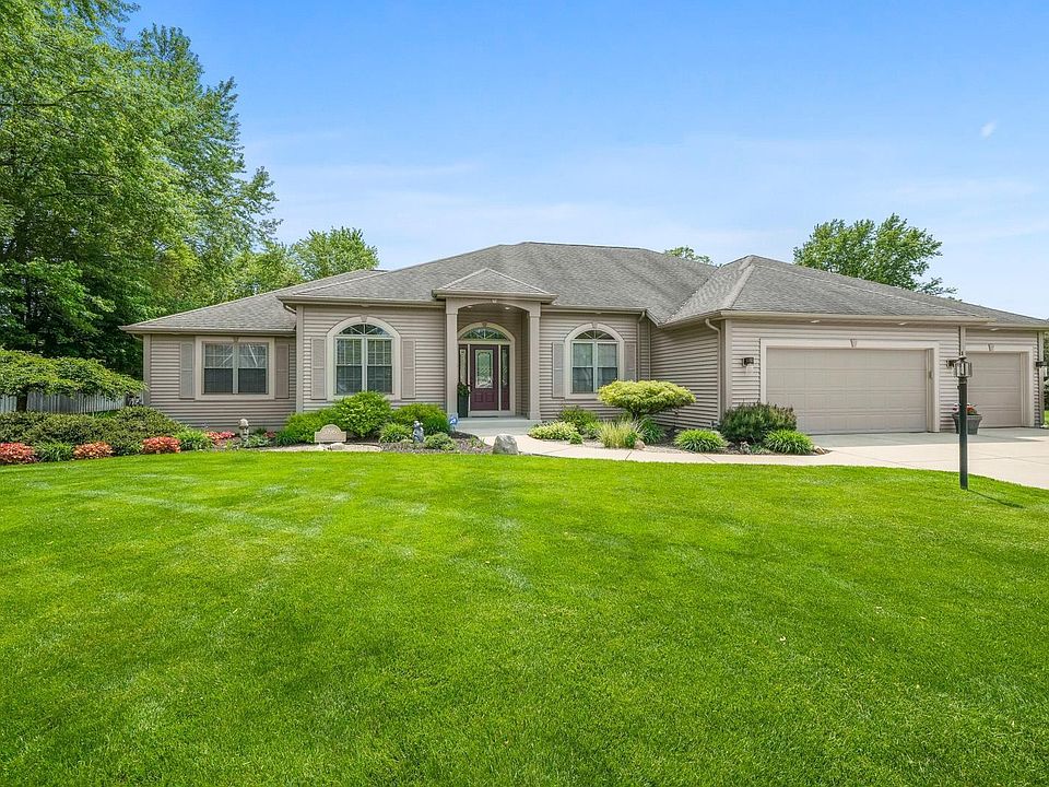 Besutiful one owner ranch home in Saddlebrook. Home and yard have been meticulously maintained. Spacious, open floorplan includes rooms for all your precious belongings. The great room is split by a two sided fireplace. Joyful kitchen has been updated with granite countertops and all new appliances. Many of the cabinets include pull out convenience. Just outside the kitchen is a spacious walk-in pantry. The charming master bedroom suite includes a trayed lit ceiling and sliding doors to the deck. Master bath has soaking tub, double vanity, private space with stool and shower plus a large walkin closet. There is a split wing with two additional bedrooms and full bath. Extra wide open staircase leads to basement that has been plumbed for a bath and a bar. The basement is extra deep and ready to be finished. There is also an egress window. Hi efficiency furnace with zoned heating, new in 2022. Fify gallon hot water heater has power vent , new in 22. Oversized deck rebuilt and gazebo with shades added in 2019. Spacious three car garage with pulldown staircase to attic storage. Don't miss the nicely finished half bath in the garage. This is such a special package you will want to call it home.