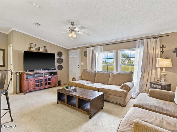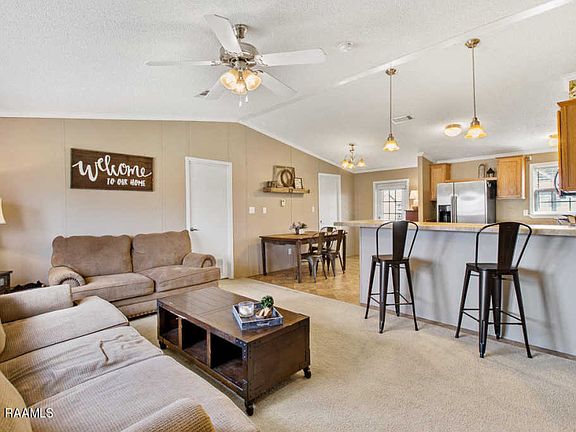 Much to love at this well-maintained, updated 2008 double-wide home on a street with no through traffic. Half-acre, level lot with ample front and back yard! Home has full skirting and concrete slab. Oversized 2-car carport with vaulted roof could also serve as a gathering place for BBQs and crawfish boils! Large U-shaped kitchen is open to living room and dining area. Additional dining seating at the large snack bar. Stainless steel appliances. Desirable split bedroom floor plan. Master bedroom suite has whirlpool tub, separate shower & walk-in closet. Updated paint colors.