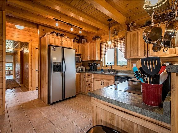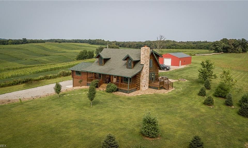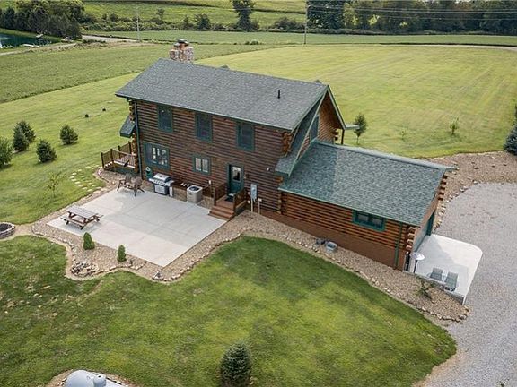 Stunning and meticulously maintained log home with gorgeous panoramic views of a beautiful countryside. 3 BD 4BA. Quality throughout. Enjoy a cozy fire in the striking stone fireplace in the living room with vaulted ceiling and a view of the lovely loft on the second level. Charming Hickory kitchen w/stainless appliances. Magnificent master suite addition in 2016 with attention to every detail from the tiled walk-in shower to the dual sinks & walk-in closet. Wonderfully finished lower level, 2-car attached garage plus 30x48 pole building. Front porch and inviting back & side patios. Sits on 5.1 acres.