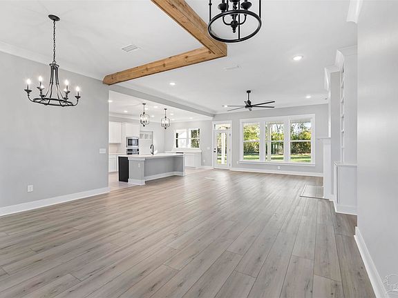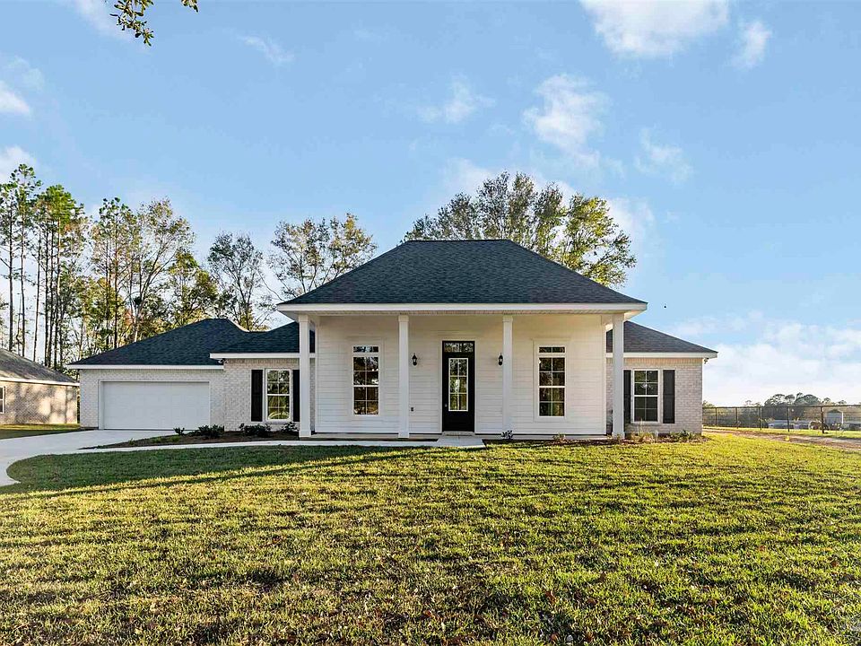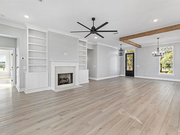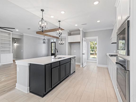 This custom new construction home exudes modern elegance and thoughtful design, offering a perfect blend of comfort and sophistication. With 2,477 square feet of living space, this 3-bed, 2.5-bath home is a testament to quality craftsmanship. Step into the abundant natural light and be captivated by the open-concept living area adorned with 10-foot tall ceilings, creating a spacious and airy atmosphere. The heart of the home is the kitchen, boasting a large island that overlooks the expansive living room. The kitchen is a culinary delight with its natural gas cooktop, quartz countertops, and elegant wood cabinetry. There is a convenient beverage center on one side, complete with a wine cooler and a spacious "Messy Kitchen" pantry with wood shelves, wood cabinetry, and a full-sized sink on the other. This space caters to all your storage and prepping needs. Entertain in style in the living room, where a grand natural gas fireplace takes center stage, framed by a built-in entertainment center. The oversized master bedroom is strategically located next to the laundry room for ultimate convenience. The master ensuite is a spa-like retreat, featuring a freestanding soaking tub and a generously sized walk-in shower with dual shower heads and a rain shower head above. The additional 2 bedrooms are no less impressive, each boasting spacious walk-in closets and custom built-in shelving that adds a touch of character. Whether it's storage or style, these bedrooms take care of your every need. Embrace the Florida lifestyle with the large back patio, perfect for backyard BBQs or simply enjoying the sunshine. You'll also notice the fresh sod that has been laid and a full irrigation system to keep it healthy and lush. The 2-car garage and mudroom with a built-in "drop zone" add functionality to the home. Located near restaurants, schools, shopping and not to mention just 40 minutes to beautiful Pensacola Beach!