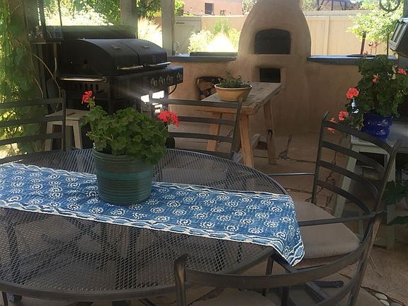 A tranquil oasis, secluded among mature trees. You will find a three bedroom home with a studio/office. The kitchen, with a wood burning fireplace is open to a dining sitting area. The great room with French doors leads to a solar collecting greenhouse. A first floor bedroom has its own entrance to a private portal. On the second level, you will find the studio/office and two light filled bedrooms. The master suite opens to a deck capturing magnificent views of the Ortiz Mountains. The outdoor patio includes a charming "Summer Kitchen", with a dining area that is covered by a pergola and hanging grape vines. The established perennial gardens and fruit trees are enhanced by the babble of the waterfall and Koi pond. Outside the interior courtyard, you have the makings of a fully fenced small ranch. A 3-stall horse barn, chicken coops, a garden building with raised vegetable beds and a large hay barn. This unique property is approximately 20 minutes from the Santa Fe Plaza.