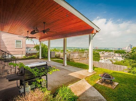 Magnificent view of Cincinnati from single family home with covered heated patio and ceiling fans plus a deck and small yard. House is in fabulous condition with a full bath on each floor. Kitchen has wonderful views to downtown Cincinnati with a sliding door to access outdoor living space.. Fabulous lower level has pellet stove, bar, full bath and storage space; could be used for a family room; home office or a 4th bedroom. This lower level has a walk-out door to the backyard; washer/dryer off of the kitchen. Small pets allowed with extra deposit. Very short easy commute to CVG airport, grocery, hospitals, stores and downtown Cincinnati or anywhere in the northern greater KY area. Lovely quiet neighborhood! This home is available May 1st. On street parking which is not difficult at all to find. Small pet allowed with pet deposit. Tenant cares for small yard and an electric mower is provided by owner. SHOWINGS START APRIL 18TH. Street parking. Tenant responsible for all utilities and lawn ( small lawn and an electric mower is provided). Landlord takes care of cutting the hill.