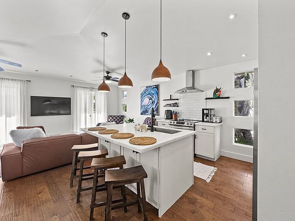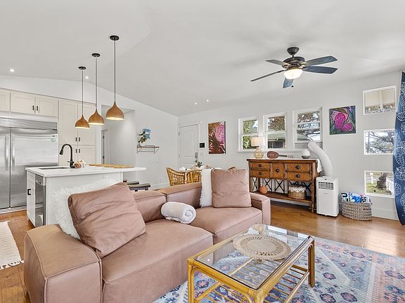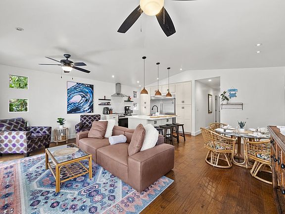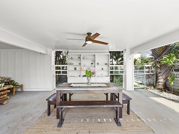 Adjacent to the living area, the home features lanai areas with outdoor seating, offering a comfortable extension of the living space into the outdoors. You can relax in the gentle Hawaiian breeze and enjoy the beautiful surroundings here.