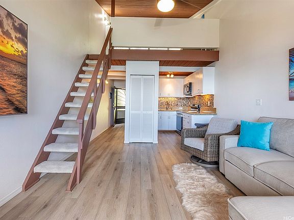 Live life like you're always on vacation, just steps from the ocean. Perched above Kaaawa’s coastline, Makaua Village #526 offers a rare chance to own a 1BR-style Loft-Studio condo with panoramic ocean views from one of the highest vantage points in the community. This spacious 537 sq ft unit (largest of its kind) features soaring vaulted ceilings, vinyl plank flooring, new carpet installed upstairs, and clear pride of ownership. Includes one assigned parking stall. Pet-friendly community with pool, party pavilion, car wash station, and lush mountain surroundings. Steps to the water and just around the corner from the iconic Crouching Lion trailhead—famous for its sweeping views right above the complex. Minutes to the newly reopened Crouching Lion Restaurant, Kahana Bay, and endless beaches. Easy drive to Kaneohe, Laie, and BYU-Hawaii. Turn-key and flexible—ideal as a home, escape, or investment. 3D virtual tour available. Book your showing today!