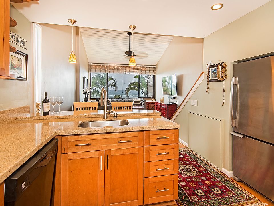 Must see quick before it's gone! Top to bottom remodel with beautiful unobstructed ocean views and the beach is right across the street. This end unit features an awesome open kitchen/dining/family room layout with a full bed and bath on the main floor. The loft area has been converted into the master bedroom and the lanai has been enclosed for added living space. This property has it all including a heated salt water pool, bbq/rec area, hiking trails, park like landscaping, and a great location right at the foot of Crouching Lion. Sale also includes master queen bedroom set with desk & chair, bedroom Samsung TV, matching leather couch and easy chair, and a 65" Samsung UHD Smart TV. Watch the virtual tour and schedule your appointment today.