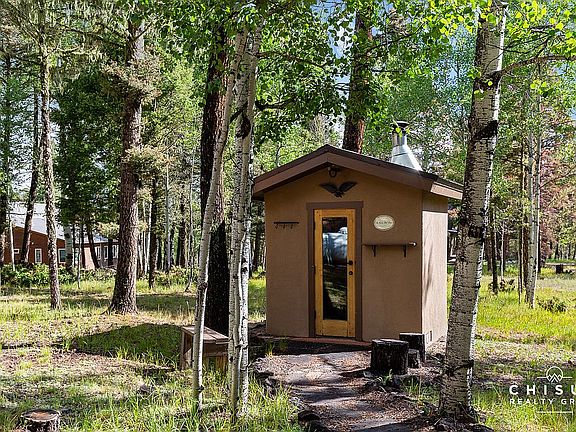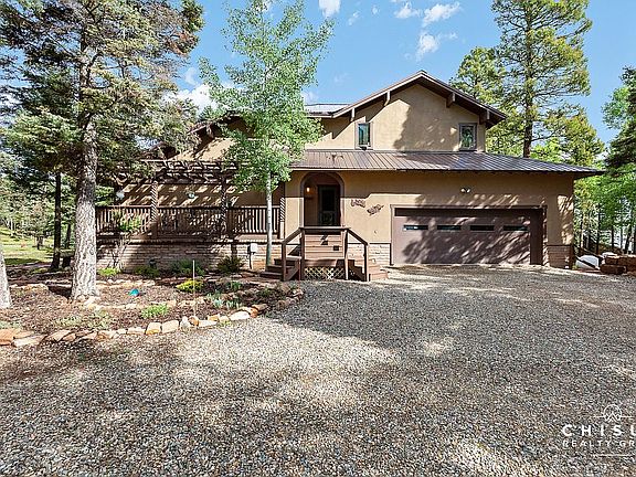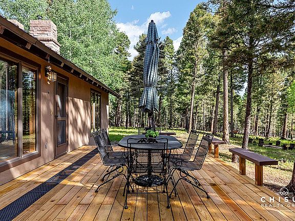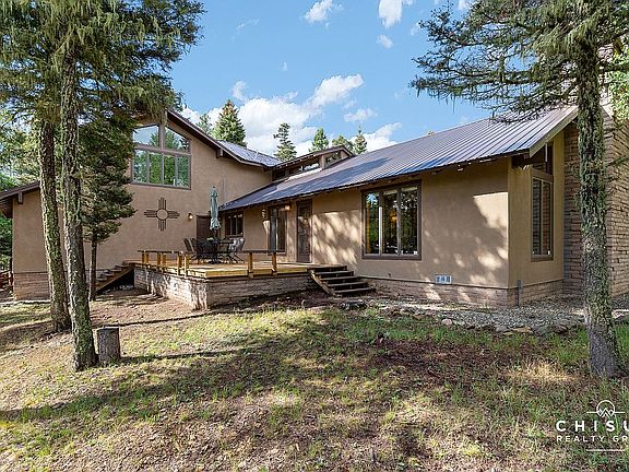 Situated on an oversize 1.45 acre lot, sits this lovely home in the mountains of Angel Fire. 51 Alpine Lake Way is surrounded by towering evergreens providing a very peaceful setting even though it is within walking distance to Monte Verde Lake and a short drive to the Angel Fire town center and ski basin. As you approach the home, you'll be impressed with the stucco siding, a large flagstone pathway and architecture that beautifully blends the southwest with a mountain lodge. Wildlife is abundant and can be enjoyed from the two decks, covered front porch, or as you stroll through the property to the detached sauna! Inside, you'll find a large great room with vaulted tongue and groove wood ceilings, wood beams and a wood-burning fireplace surrounded by stone. The galley kitchen has been remodeled with tile backsplash, updated countertops, sink and pantry. All three bedrooms are master suites featuring vaulted ceilings and ensuite baths. Two of the bathrooms were recently remodeled with stunning tile work and granite countertops. 51 Alpine Lake Way is sold fully furnished so please call and ask to see a property inclusion list.