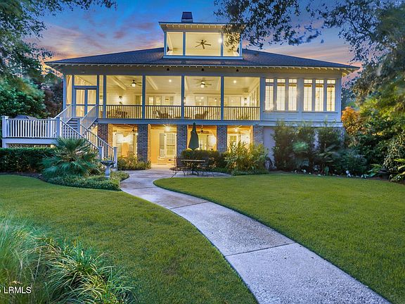 Experience the charm of timeless Southern elegance with this Louisiana-style Creole plantation home, inspired by renowned architect A. Hays Town and beautifully situated on true deep water along Battery Creek. Built in 2015, this home masterfully blends old-world character with modern convenience, featuring rustic finishes, old cypress lentils over the downstairs windows, and a welcoming bead board high-ceiling entrance.