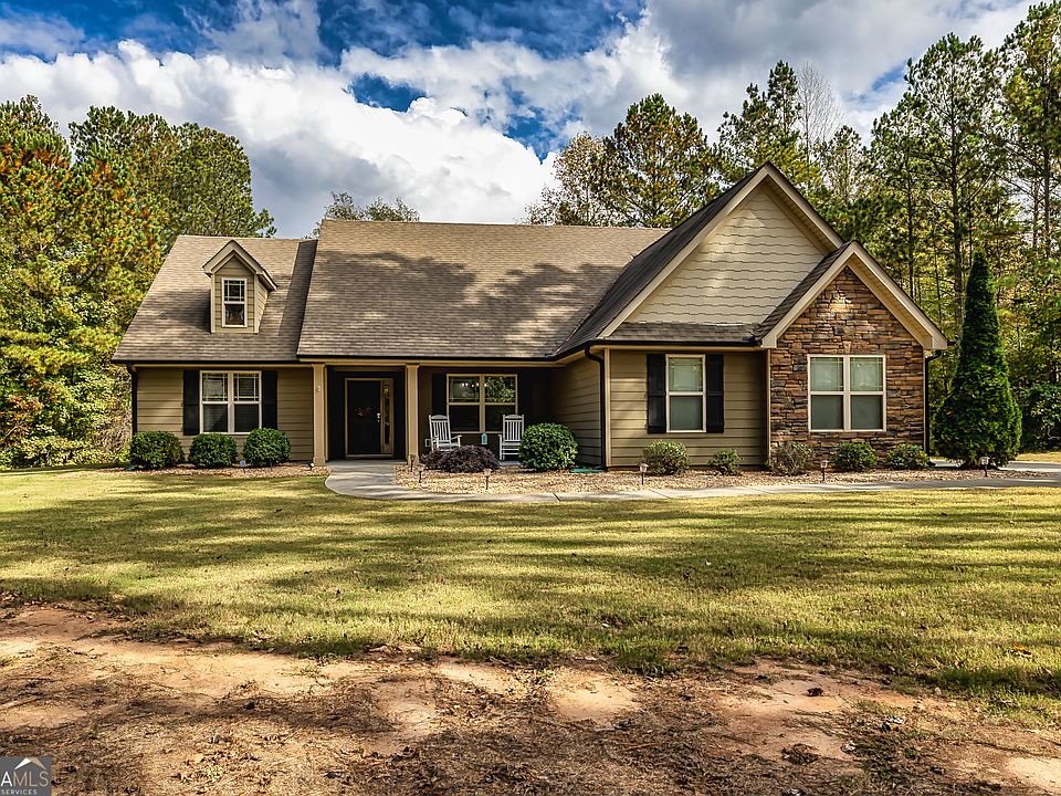 Beautiful ranch-style home offers vista of private pond from covered back porch, the perfect spot for game day celebrations, morning coffee, and winding down at the end of your busy day. Inviting open concept home. Foyer flows into formal Dining Room and vaulted Great Room highlighted by a wood-burninig, stone fireplace. Well-appointed Kitchen (granite tops and stainless appliances) and Breakfast Room also offer views of the pond across the landscaped backyard. Popular split bedroom plan offers privacy for everyone. Owner's Suite boasts double trey ceiling, sitting area and walk-in closet. En suite Bath features garden tub, separate shower, private water closet, and dual vanities. Secondary bedrooms share Hall Bath with shower/tub combo. Home is nestled on a wooded 1.3+/- acre site in a quiet cul-de-sac. Yard offers fenced area for small pet. The Brooks is a hidden gem of a neighborhood conveniently located just south of Highway 16.