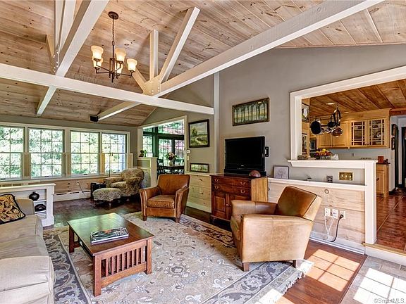 Absolutely gorgeous home private and secluded set on over 2.5 acres Bright and spacious open floor plan with shiplap wide plank walls & ceiling in living room, vaulted shiplap ceiling in eat-in custom kitchen, & a lovely sitting room with wood stove. The kitchen, with its 2 story breakfast area is an aesthetic dream boasting palladium windows & flows eloquently into the family room making it just perfect for entertaining. Granite counters, butcher-block island over state of the art cabinets includes double door pantry with pullout drawers, desk, & wine rack. Wide staircase to second level includes a master bedroom with vaulted ceilings and wide - plank Pine floors (also in every bedroom. Plank sauna-like walls & ceiling in full upstairs bath with custom built double vanity, walnut sealed with boat varnish, copper sinks. The bonus room over the garage has a huge window wall overlooking the property, a lovely balcony, oak floors and a half bathroom. The attached garage is extra deep and there is a 2.5 detached garage (Carriage House style with cupola. The backyard is a nature lovers paradise with patio off kitchen, a gazebo and herb garden. With quick access to route 9 (about 5 min and convenient accessibility to I95 and I91, this home is perfectly located. Elementary school is also just down the road. This home is truly the complete package.
