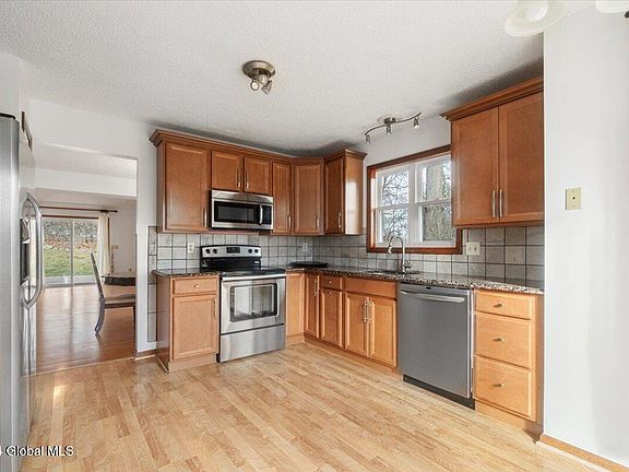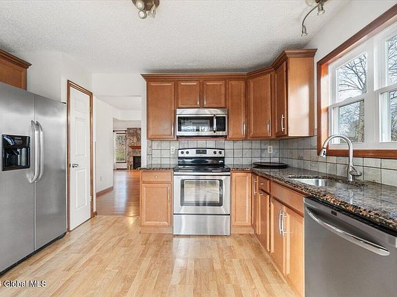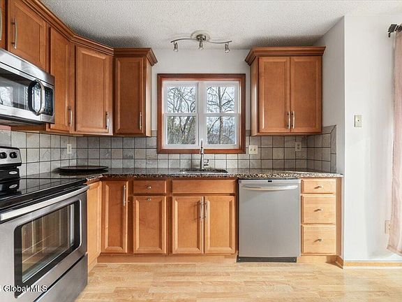 MULTIPLE OFFER DEADLINE 12/23 @ 12pm! End-unit townhome, nestled on quiet cul-de-sac in Niskayuna School District! Step into the open living area featuring wood floors, vaulted ceilings, formal dining room, cozy living room with wood-burning fireplace & sliding doors leading to backyard patio. Enjoy a spacious kitchen with stainless steel appliances, sleek granite countertops & room for dining. First-floor primary suite includes ensuite & ample closet space. Convenient first-floor laundry room & half bath. Upstairs find a bedroom w/ large walk-in closet & Jack-and-Jill bathroom, loft with built-in shelves overlooking the airy living space, & versatile finished room with skylights. 2-car garage, private driveway & ample storage. Windows, roof, kitchen & appliances updated in '1